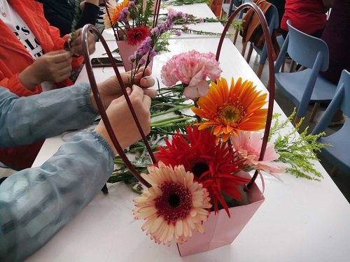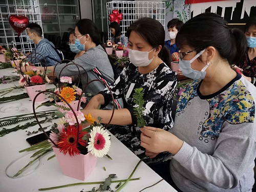 活动邀请了专业的花艺老师手把手教社区居民插花技巧。从修剪花枝、造型的技术知识、到探讨插花要领和注意事项,帮助大家更好的了解插花艺术。现场俨然一片花的海洋,在花香四溢的悠闲氛围中,大家兴致勃勃,一边跟着老师学,一边用心地插花,你一言我一语,并随着老师互动、探讨,现场气氛热烈融洽。居民们跟着老师的步骤,将一朵朵鲜花错落有致地插在花蓝中,并通过适当的修剪及装饰成一个美丽的作品。康乃馨、非洲菊,蒲葵等,这些花枝经过阿姨们巧妙的创意、组合,勾勒出一盆盆赏心悦目的艺术品,同样的花在不同的人的手中绽放出不一样的美。