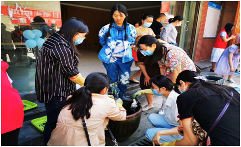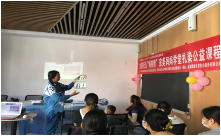 此次活动邀请到了彭镇柳江东染坊创始人张新苗,她带着妈妈们一起感受传统扎染工艺的魅力。张老师现场详细地介绍了扎染的历史起源、传承、分类、艺术特点以及制作原理和操作方法等知识,并向大家展示了自己原创的成品植物扎染作品。大家被老师的展示深深吸引,纷纷跃跃欲试。经过基础知识学习后,妈妈们在老师的带领下开启了扎染艺术体验。