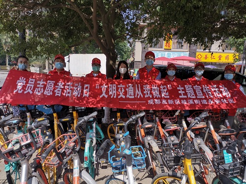 近日,成都高新区桂溪街道永安社区联合中建六局分公司党员志愿者队伍,前往辖区半岛城邦河边绿道开展党员志愿者义务劳动,进行共享单车摆放和清理垃圾。