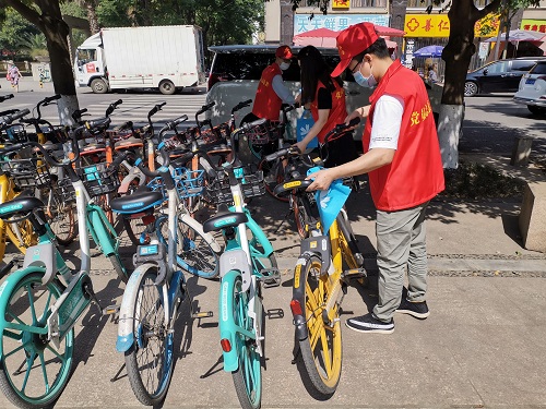 8名党员志愿者自带环保袋,分成两队前往河边进行绿道的垃圾清理,一路上捡拾枯枝树叶和各种丢弃物,积极向过往的居民群众宣传爱护环境的理念;同时,对河边乱停乱放的共享单车进行了清理,党员志愿者们逐一将它们统一移动至规定的停放位置,整齐有序的摆放。