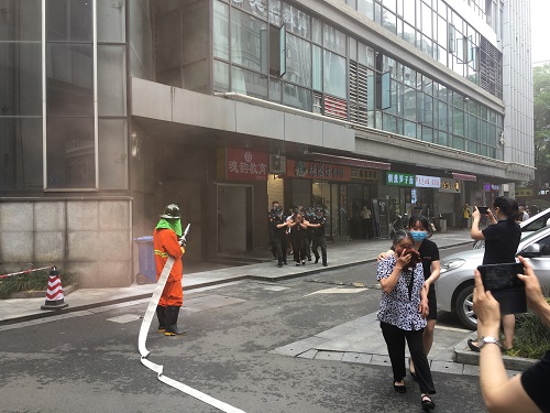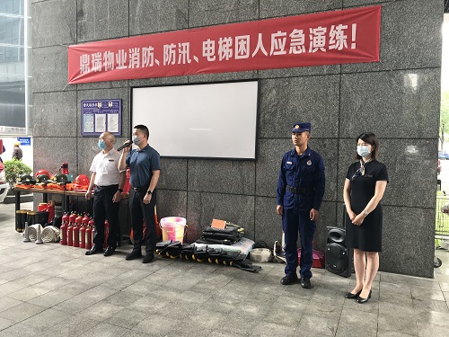 成都消防特勤二中队队员对各类消防器材,如灭火器、消防斧、救援绳、腰带、防毒面具、消防水带等使用方法进行了讲解。随后,现场模拟应急疏散和救援失火、浓烟被困人员,并进行了消火栓水带灭火、油盆灭火等实操演练。最后,理想中心物业对汛期防范、电梯困人处置流程进行了展示。