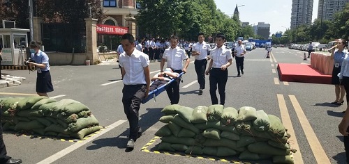 活动当天,各防汛代表队齐聚在衡信英伦物业管理有限公司B区机动车车道进出口,首先开展的是防汛技能竞赛,包括20米搬运沙袋砌防洪墙和20米担架救援受伤人员,现场角逐激烈。下午三点,防汛演练活动开始,这次演练的背景是因强降雨,水势猛涨淹没中德英伦联邦104车场出入口。在接到通知后,总指挥接到报告后决定启动防洪应急预案
