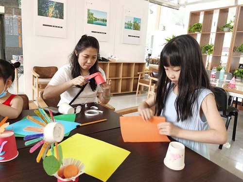 活动中,老师首先向亲子家庭围绕一次性纸杯的由来和制作一次性纸杯的材料,来讲解这些平常生活中长期使用的物品,告知大家纸杯表层有着防水的腊,且不属于可回收物品,后期处理起来比较麻烦,所以不能肆意浪费一次性纸杯。为培养孩子们的环保节约意识,养成良好的生活习惯,老师让大家把从家中带来的一次性纸杯,参照老师提供的图片和利用社区提供的材料,由家长和孩子共同动手将一次性纸杯制作成美观有用的物品。有的孩子制作成精美的笔筒,有的孩子制作成可爱的花瓶,还有的孩子制作成有趣的工艺品。