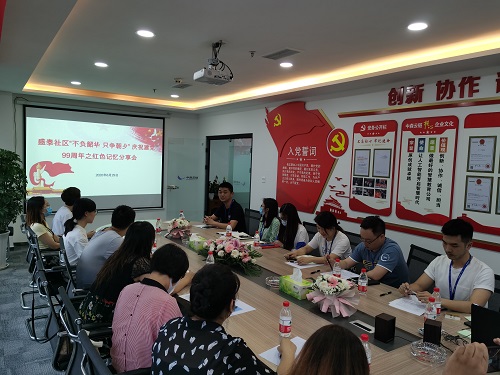 为庆祝中国共产党成立99周年,6月29日芳草街街道盛泰社区以“不负韶华·只争朝夕”为主题,庆祝建党99周年之红色记忆分享会在中森云链党群活动室开展,参加党员20余人。