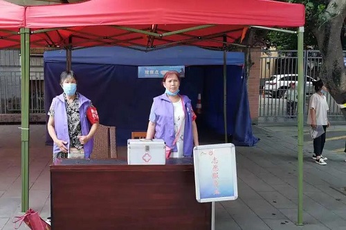 正街社区组织社区志愿者与国网电力成都高新党员志愿服务队,在西藏中学门外设立志愿服务点位,提供矿泉水、文具用品、医药品、医用口罩等服务,维持交通秩序,帮助交警引导车辆通行,为考生提供安静有序的环境,为考生家长提供便利和帮助,助力高考。