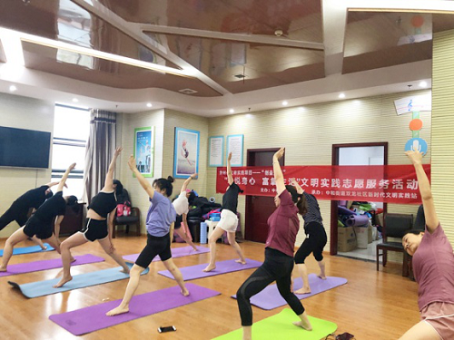 在活动开始前,志愿者引导上课的居民消毒、做好防疫措施,有序签到。课堂上,来自不同年龄段不同职业的居民聚集在一起,在志愿者老师的带领下,学员们从最基础的站姿、坐姿势开始做起。一呼一吸一张一弛一转一回,学员们很快就进入状态,投入到瑜伽带来的放松与乐趣。志愿者老师不时弯腰蹲下纠正学员的错误或者不标准的动作。志愿者表示:“瑜伽不仅能使身心得到锻炼和减压,同时能扩大社区女性朋友间的沟通交流,建立自助互助支持网络。”