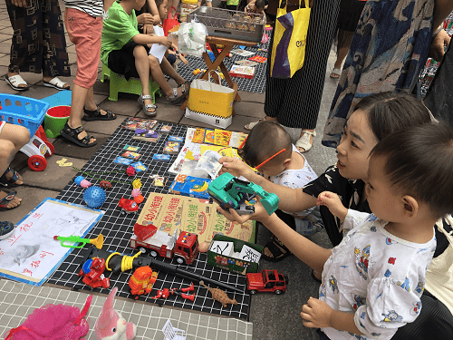 许多的小朋友早早的就来到活动现场。9:30活动正式开始,首先,到场的小朋友通过抱团游戏分了五个小组,这次活动的目的不是只有个人售卖个人盈利,还有要达到与小组一起取得最高营业额的目标,这不仅可以调动小朋友售卖积极性,也可以培养他们的团队意识。随后,小朋友们把自己家中搁置已久的玩具、书籍等物品拿出来,这些在家里角落无人问津搁的物品在跳蚤市场上却“大显身手”,他们开始精心布置自己的摊位,取好了响亮的店铺名,摆出了自己摊位的“营业执照”,毕竟有漂亮的摊位才能吸引顾客的眼球嘛,没过多久,一个个放满精美商品的小摊位产生了,俨然是一个微型的“淘宝”市场,“小老板”们便开始吆喝着招揽生意,瞧他们的阵势,一点也不输给路边的小摊。顾客也在他们的叫卖声中吸引过来,来回不停地穿行,寻找物美价廉的“宝贝”,摊位一下子热闹起来,既有讨价还价,也有实力宣传,向顾客说着“宝贝”的无数好处,尽力推销。尽管会有口干舌燥,尽管有销售情况不佳,但他们都没有放弃,以最好最精神的姿态展现在每一个到访的顾客面前。