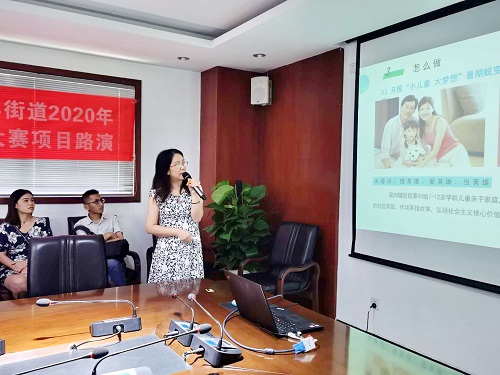 活动现场,各社区项目路演小组成员结合实际情况,积极向评委们条分缕析地介绍项目策划思路、特色亮点及场景营造构想,竭尽所能地展示自身项目的优势特色和社区发展治理深度融合效果,力争为自己的项目争取立项资金支持。