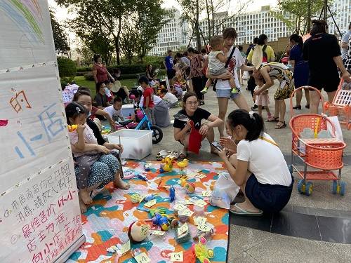 活动开始前,小店主们带着大助理有序地入场,摆好自己在家已经做好清洗和消毒工作的商品,一个个亮眼夺目的店铺招牌,仿佛都在炫耀着周末和妈妈在家度过的温馨时光;活动过程中,小店主们用稚嫩的声音,学着大人模样开始招揽生意,路过的邻居们都被这热闹的场景吸引,纷纷参与进来,现场热闹非凡。
