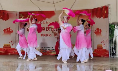 文艺汇演在秧歌扇子舞《十送红军》中拉开帷幕,群舞《为了谁》、《众志成城渡难关》、笛子独奏《我是一个兵》、《战马之歌》、童声朗诵《我的祖国》、T台走秀《红梅赞》、板胡演奏《地道战》、情景剧《红色记忆》、男声独唱《再见了大别山》、两人对唱《跟你走》、柔力球表演《跟我一起跳起来》、独舞《天堂》等精彩节目轮番上演。充分表达了大家对军人群体的充分尊敬和对伟大祖国的诚挚祝福。演出活动不仅丰富了群众的精神文化生活,更激发了广大群众参与“双拥”的积极性,为和谐文明社区建设奠定了坚实基础。