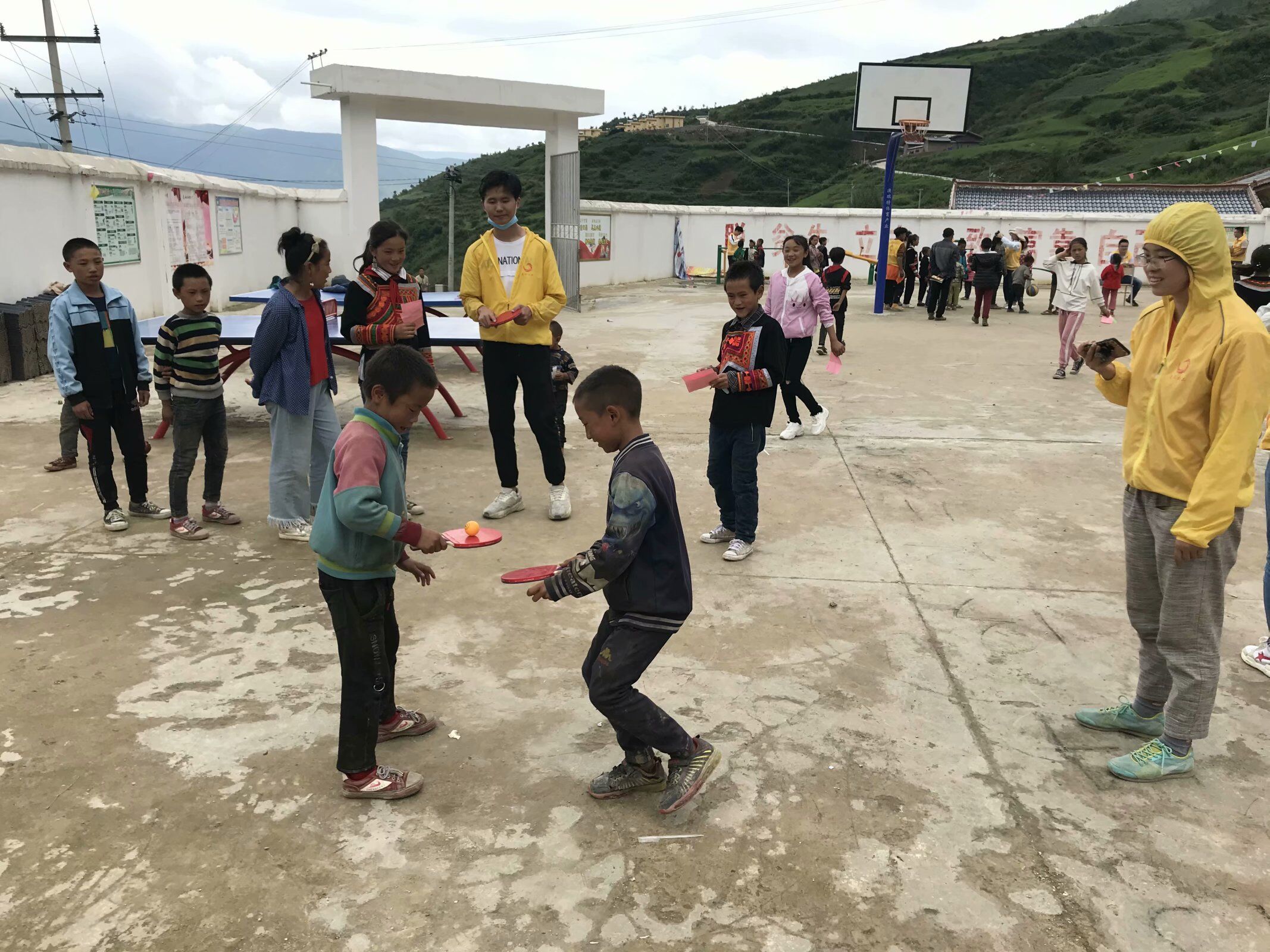阔步向前,我能赢,看吧,孩子们用筷子夹着玻璃球勇敢地前进;因为信任,所以闭眼前行,孩子们用布巾蒙住了眼睛,努力的探索者前进,体现了无所畏惧的运动精神,尽管我们来自乡村,可我们也有自己的风采;排好队,给伙伴打气,给自己打气,双人篮球项目,孩子们齐心协力,团结凝聚,用坚实的脊背夹着篮球一步步往前,就算我们来自乡村,在志愿者们的帮助下用心教导的项目下,我们也能锻炼出不输于大城市孩子们的工作能力;你一球,我一球,美好永久,孩子们生活在乡村,不像城市里的孩子总是被关在家里,采竹的孩子们一起在露天玩耍,彼此有着深厚的感情,乒乓球接力游戏让孩子们面对面,两个人一起发力,培养他们学会合作,养成默契,感受彼此,才能够获得成功。