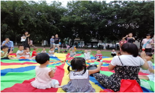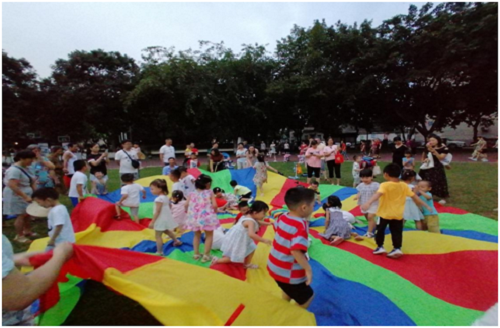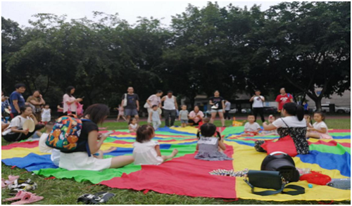 活动开始之前,社工进行现场招募,在体育场锻炼的小朋友和家长们积极参与,踊跃报名。老师先是将彩虹伞铺开,家长带着小朋友坐在彩虹伞上围成了一个小圆圈,开始了“小手拍拍”的游戏,在这过程中,有很多小朋友被吸引了过来,纷纷加入其中。