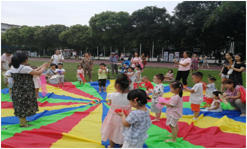 随后,开始了“扔纱巾”游戏,老师和小朋友们随着音乐的旋律开始扔纱巾,这个游戏锻炼了小朋友们的感触能力。然后老师又带领家长和小朋友们一起玩了奥尔夫音乐游戏,促进小朋友的音乐律动感。最后,老师与家长一起拉开彩虹伞,让小朋友们在彩虹伞下尽情的蹦跳嬉戏。后面,老师与家长拉着彩虹伞围成一个圆圈,开始进行抓小鱼的游戏了。随着音乐的响起,老师和小朋友们就开始用彩虹伞来抓小鱼了,这个欢乐的游戏锻炼了小朋友的反应能力。