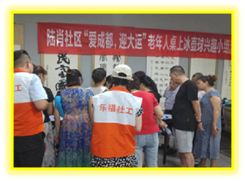 2020年8月6日上午,陆肖社区组织辖区老年朋友在新邻中心开展“爱成都·迎大运”桌上冰壶球活动。桌上冰壶球运动既能让老年人放松身体、得到锻炼,又能在团队赛中促进交流合作,是一项儒雅的君子运动,其运动量适中,安全性高,有助于老年人保持记忆思考能力,非常适合老年人参与。