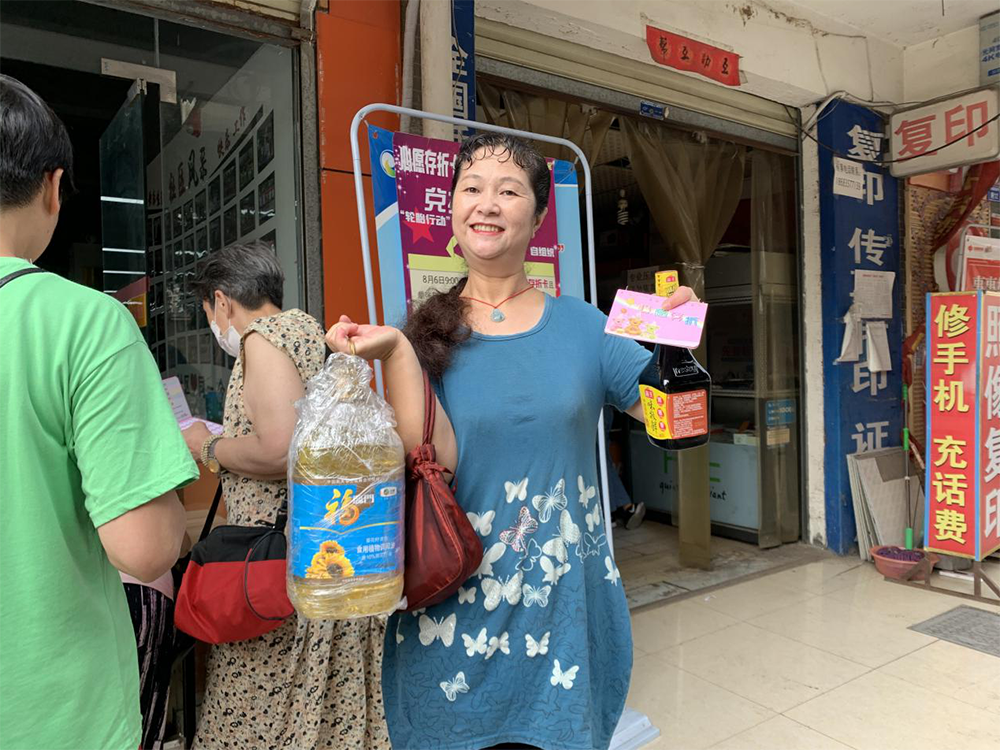 本次活动为积极参加社区活动的居民进行积分兑换活动。在向居民展示积分礼品及相应所需积分后,组织居民有序兑换,保障活动有序进行。居民凭心愿卡活动积分到社区服务点进行积分兑换,礼品有食用油、抽纸、酱油、洗手液、醋等。王阿姨拿到物品后高兴地说:“社区真好,以后有需要我的,就通知我,一定多参加社区活动。”