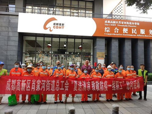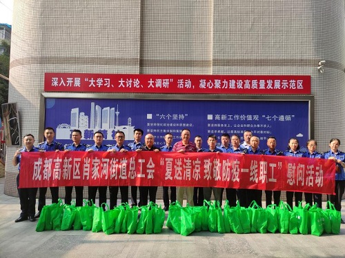 为深入贯彻落实党的十九大精神,改善夏季高温一线作业职工的生产、生活环境,及时把党和政府的关怀送给奋战在高温一线的职工,帮助他们安全度夏、清凉度夏。深入战斗在防疫一线的医卫工作者、一线公安民警、劳模工匠以及高温高湿一线职工、环卫、交通运输等户外劳动者的走访慰问,并发放夏送清凉物资。肖家河街道办事处、总工会组织开展2020年“夏送清凉 致敬防疫一线职工”慰问活动。