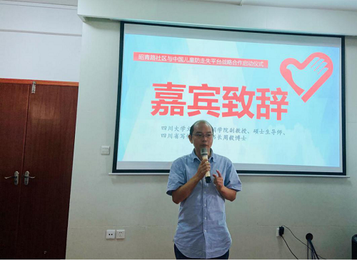 紧接着,四川大学文学与新闻学院副教授、玉成志愿服务与研究中心创始人周毅通过分享自己亲自参与寻找走失儿童的例子,向志愿者们讲述了中国儿童防走失平台和相关部门联动在寻找走失儿童过程中起到的重要作用,表达了昭青路社区与中国儿童防走失平台及玉成志愿服务与研究中心达成战略合作的重要意义。
