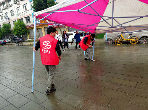 工作人员从早上九点整开始搭建舞台,准备灯光、音乐、LED板,途中一直是绵绵细雨,但工作人员依然在为今晚的晚会坚持准备着。下午一点,工作人员在日间照料中心开会,明确各自的分工,熟悉活动流程,对一些工作上的细节作出了调整,并为彼此加油打气。下午四点,工作人员开始布置现场,准备桌椅,搭建雨棚,清扫舞台上的积水,为部分围观的居民介绍。下午五点,志愿者也参与其中,工作人员与志愿者们开始摆放观众席的坐凳,并帮助表演人员进行彩排,为签到的居民分发抽奖号码卡。六点,工作人员再次清扫舞台,为演员们提供更完美的舞台,同时开始维持现场秩序,为在座的居民们分发了荧光手拍,一起激动地等待的文艺汇演的开始。