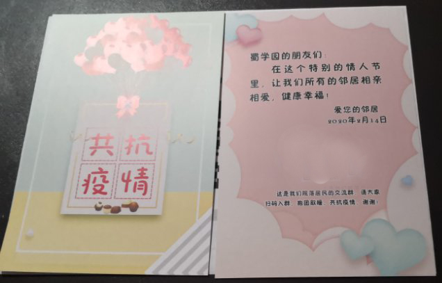 2020年2月14日,这个特殊的情人节,同城的亲朋好友们也被隔离成了“异地恋”,但疫情期间,也让大家更加懂得珍惜。“蜀学园的朋友们,在这个特别的情人节里,让我们所有的邻居相亲相爱,健康幸福……”一张小小的贺卡,代表的却是邻居之间深厚的情谊,今天一大早,成都市锦江区春熙路街道青石桥社区的志愿者小胥便来到蜀学园的大门前,为每一位邻居送上了这份特别的情人节礼物。