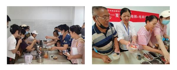 本次就业创业培训活动邀请到中和辖区内的创业达人——成都小迷妹,为大家现场教授冰粉在售卖前的准备与制作流程,并大方分享了线上引流到线下售卖冰粉的新经济模式。此次培训活动也在抖音线上同步直播,通过在线直播、实时互动等灵活多样的形式开展,让更多没能参与到此次活动的居民在线上也能观看教学培训。活动中,小迷妹为大家示范手搓冰粉籽儿,居民们本着增加一技之长的目的,也细致分工,切水果、煮芋圆、煮汤圆等,在大家的配合下所有工作准备就绪,成型的冰粉再搭配上各种好吃的小料,一碗清凉爽口的冰粉在大家的巧手下呈现出来。居民们纷纷表示学到了技术的同时,通过现场实时互动、教师答疑也学到了直播引流等经验,受益匪浅。