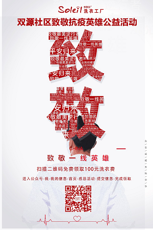据了解,此次活动只通过线上形式进行,抗疫一线的医生护士、社区工作者,可通过索勒依洗衣工厂微信公众号完成相关信息提交后,领取由索勒依洗衣工厂提供的价值100元的洗衣费。