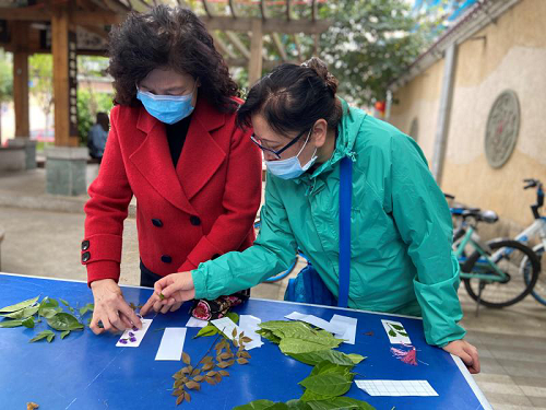 在活动开始的时候,社工就给大家介绍了本次活动的流程,同时把事先准备好的书签材料发给大家并讲解示范植物书签的制作步骤和技巧。“阿姨,这个你可以随意发挥,不一定呀做成我教的样子。”制作过程中,社工引导着参与者发挥想象力,将手中的树叶和花根据自己的喜好组合排列摆放在书签上构成美丽的图案,确定书签样式后,加上塑封膜,就完成了书签的制作。