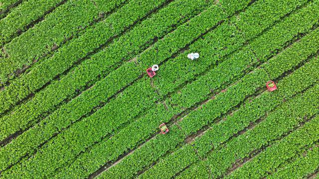 7月1日,工人在位于青铜峡市邵岗镇的益丰农业供港蔬菜基地采摘蔬菜(无人机照片)。新华社记者 王鹏 摄