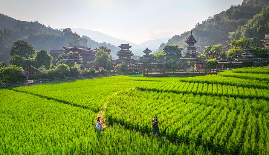 贵州黎平:侗寨晨光美 梯田稻浪新