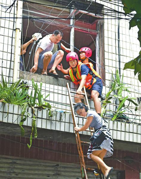 7月16日,刘德志(中)带领消防队员背送被困老人脱险。