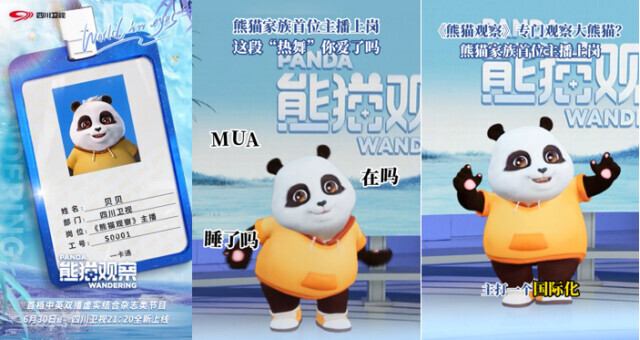 “熊猫家族”首位主播上岗!6月29日,国内首个数字熊猫虚拟主播“贝贝”公开亮相,宣布首档虚实结合中英双播杂志类节目——《熊猫观察》Panda wandering正式上线,并将于6月30日21:20,在四川卫视和四川观察同步播出!