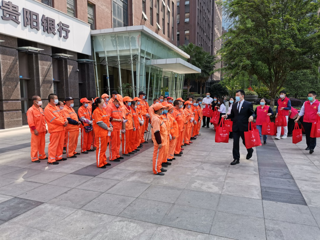 贵阳银行成都高新支行副行长袁锦竹作为党员志愿者代表向环卫工人们致感谢词,各组组长和党员志愿者也分享志愿服务心得,并为环卫工人送上了口罩、香皂、洗衣粉等爱心慰问物资。