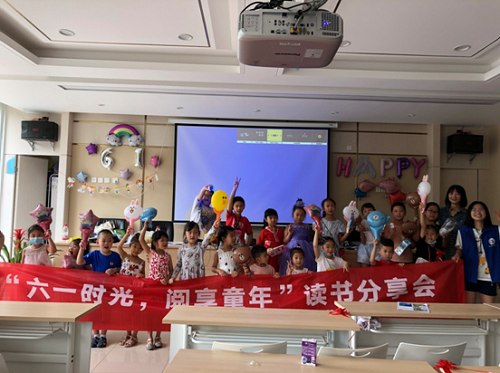 分享会开始前,工作人员提前到场,利用气球、彩带等装饰物品布置会议室,给小朋友们营造欢乐的六一氛围。老师首先邀请小朋友们进行“解手链”的游戏,在游戏中,老师要求小朋友们自己讨论完成,在欢乐的游戏氛围中正式开始了本次读书分享会。随后,老师向小朋友们分享了小故事《全都是我的》,根据故事内容,老师向小朋友们讲解同他人分享的乐趣。接着,老师通过“击鼓传花”的游戏,邀请小朋友上台分享关于自己的趣事。