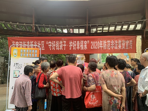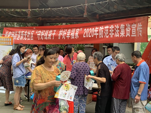 为保护辖区居民群众切身利益,提升社区居民防范非法集资的能力,增强风险防范意识,引导社区居民远离非法集资,自觉抵制非法集资,6月28日,成都高新区肖家河街道新光社区进入辖区7个院落开展了主题为“守好钱袋子·护好幸福家”2020年防范非法集资宣传活动。