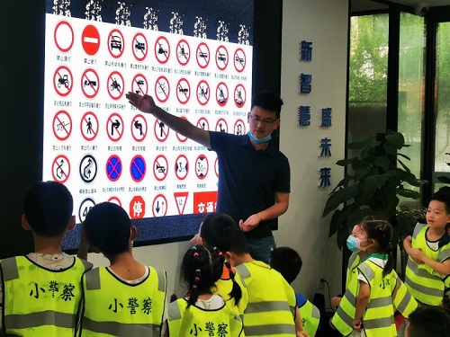 活动中,指导老师通过播放影片、提问、互动、情景模拟等方式,向孩子们讲述了警察职业有别于其他职业的特殊性,让他们了解到警察是安全守护者,遇到困难要及时求助警察叔叔。同时,教授了孩子们交通安全常识以及遇到困难怎样求助等日常安全知识。随后,在指导老师的帮助下,孩子们纷纷穿上“小警察制服”,学习交通手势,认清交通标识,熟知交通安全知识,争做安全合格小市民。