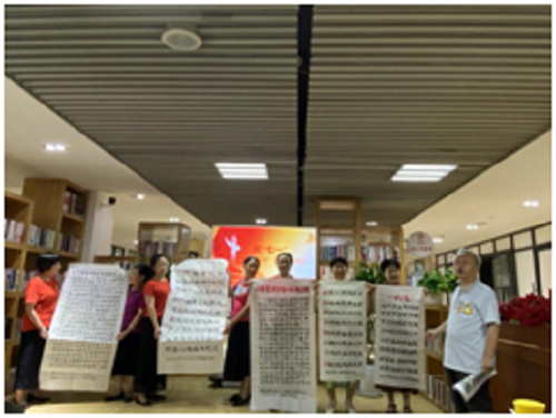 7月1日,由芳草街街道办事处主办的“党在我心中”国学诵读活动在活动中心二楼图书馆举行,来自芳草文体协会国学班的30名学员到场献礼,吸引了辖区居民群众100人参加活动。