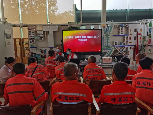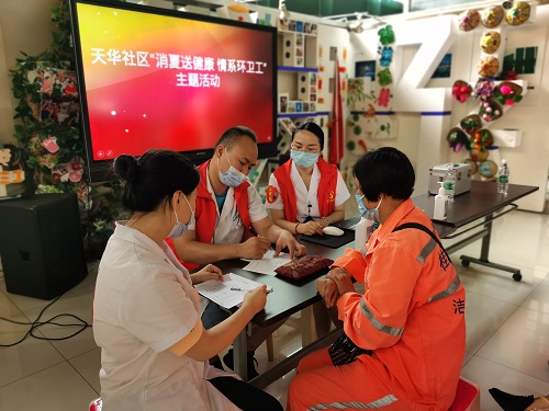 为表达对环卫工人的感恩之情,传递社会正能量,传播公益精神,奉献爱心, 7月14日上午,成都高新区桂溪街道天华社区联合至真堂中医馆在社区一楼大厅开展“消夏送健康·情系环卫工”为主题的爱心公益活动。