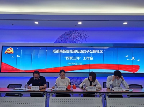 2020年8月25日上午,成都高新区桂溪街道交子公园社区临时党委在交子金融科技中心聚智厅组织召开“四联三评”工作会。交子金融园区综合党委、银泰中心楼宇综合党委、金融梦工场党支部、金融城街成都置业党支部、新城控股党支部、现代支付党支部、库珀区块链党支部、领伦律师事务所党支部代表参会。