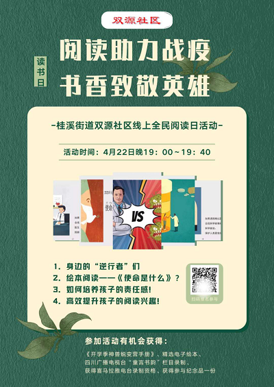 书香启迪童心,阅读点亮人生!4月23日“世界读书日”到来之际,为激发社区居民阅读热情,培养孩子阅读习惯,在当前抗击新冠肺炎疫情的特殊时期, 4月22日晚,成都高新区桂溪街道双源社区通过线上的方式开展了以“阅读助力战疫,书香致敬英雄”为主题的全民阅读微课堂活动。
