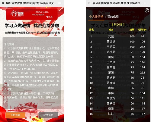 6月28日-7月1日,成都高新区桂溪街道交子公园社区还组织全体党员广泛开展“学习点燃激情,挑战迎接梦想”学习强国主题知识竞赛。
