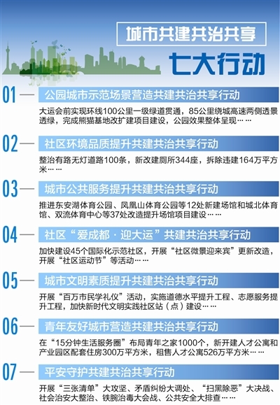 据悉,成都将深入开展包括公园城市示范场景营造、社区环境品质提升、城市公共服务提升等在内的城市共建共治共享“七大行动”,努力实现办赛与营城相得益彰,共治与共享同频共振。目前,各项行动的工作方案均已制定完成。按照计划,今年6月至2021年8月,成都将推进实施相关工作,完成“七大行动”制定的目标任务。
