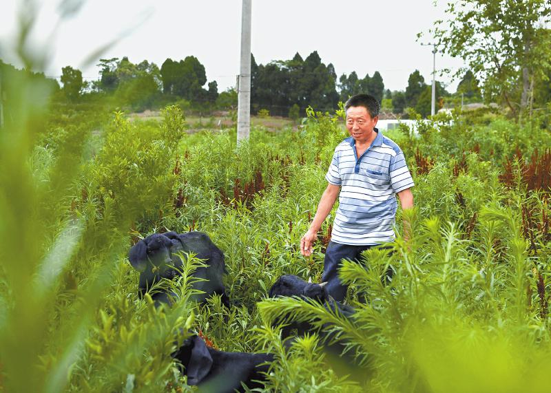 在四川乐至县金鼓村,村民杨老汉在放羊(6月12日摄)。新华社记者王曦摄