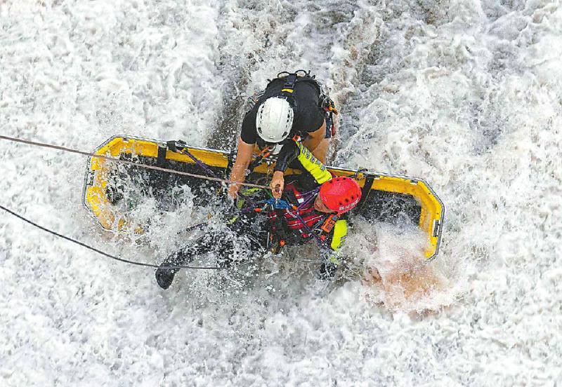 7月16日,雅安市消防救援支队和平路特勤站抗洪救灾小分队开展被困者救援技术训练。