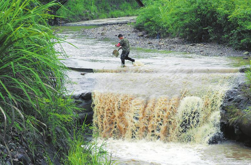 7月22日,广安市邻水县鼎屏镇石坝村的“敲锣哥”吴成全在村上敲锣预警。