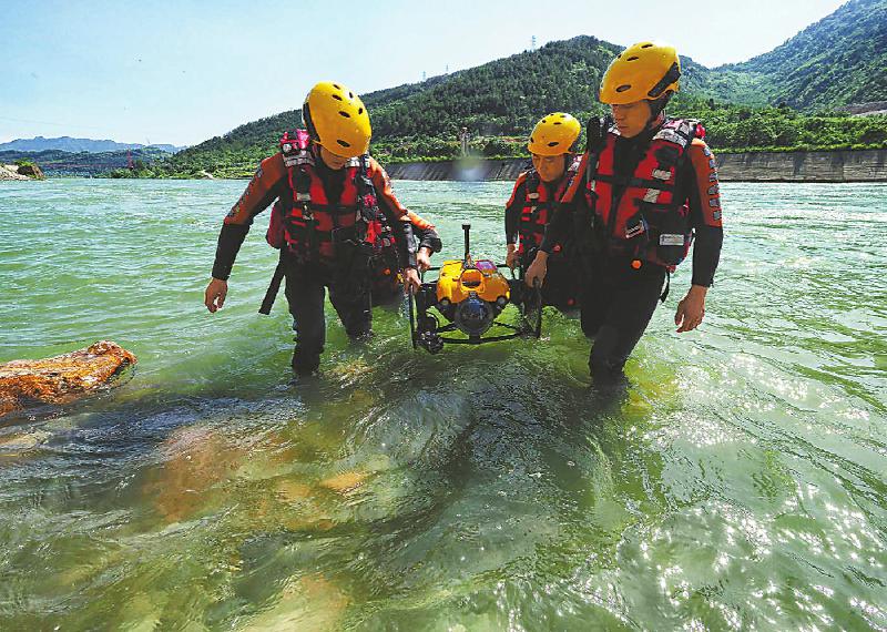 7月17日,广元市消防救援队队员在白龙江上操练水下机器人配合施救。