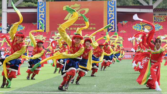 康巴大地千山锦绣,美丽甘孜万众欢腾。上午9时许,伴随着欢快的乐曲声,展现甘孜州70年巨大变迁和干部群众精神风貌的各个方队依次入场。人们身着盛装、载歌载舞,表达着对党和祖国的感恩、对全国人民和社会各界的感激之情。随后礼炮鸣响,国旗护卫队护送国旗至升旗台,全场肃立齐唱中华人民共和国国歌,目送鲜艳的五星红旗冉冉升起,庆祝大会正式开始。