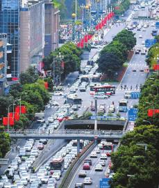 今年国庆中秋长假,自驾中短途游成为热门出游方式。图为10月4日,成都蜀都大道上车流如织。 四川日报记者华小峰摄