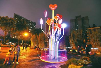 10月13日,成都北门里·爱情巷特色街区的心形光雕耀眼夺目,这条全长670米、以爱情文化为主题、以夜间经济为主业的小街正着力营造市井味、时尚范。