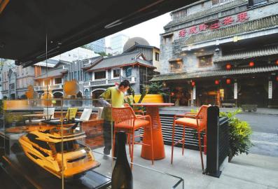 2020 10月13日,成都市华兴街一家咖啡店的店员正在整理餐台,改造后的华兴街特色街区,融入了文创、咖啡、休闲等新业态,复古时尚在这条小街相织交融。
