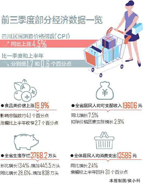 10月19日,国家统计局四川调查总队发布前三季度全省民生经济运行情况数据。前三季度,四川居民消费价格指数(CPI)同比上涨4.5%,比一季度和上半年分别低1.7和0.6个百分点。其中,9月份CPI同比涨幅收窄至1.9%,自去年2月以来,首度重回“1时代”。