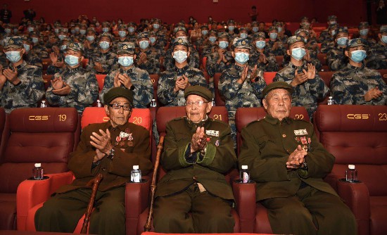 “雄赳赳,气昂昂,跨过鸭绿江。保和平,卫祖国,就是保家乡……”10月25日,成都中影晴瑞影城CGS“致敬英雄儿女”《金刚川》观影活动现场,志愿军老兵王光柄、韩雨秋、郭明清,邓云康、“特级英雄”黄继光后人黄拥军和黄中果,还有部分现役军人代表共同观影。观影结束之后,志愿军老战士邓云康唱起了当年在朝鲜战场上曾经鼓舞过无数志愿军战士的歌曲。
